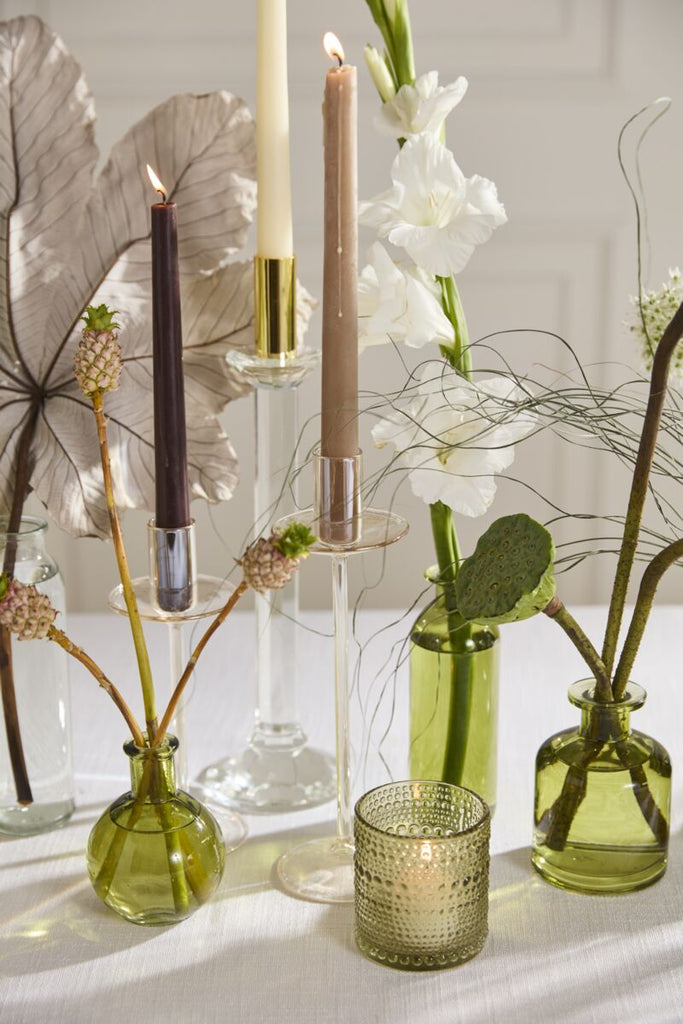 Add a touch of modern elegance to any event table with the Cassidy Candleholder, a slender glass taper holder with a subtle iridescent champagne hue. The color is versatile and takes on tones of any adjacent items, allowing the Cassidy to be ideal for any event's color story. A circular base and plate just below the opening are crafted from mouth blown borosilicate glass. Style each of the three sizes beneath a 4" glass sleeve (sold separately) for a soft, sophisticated tablescape.