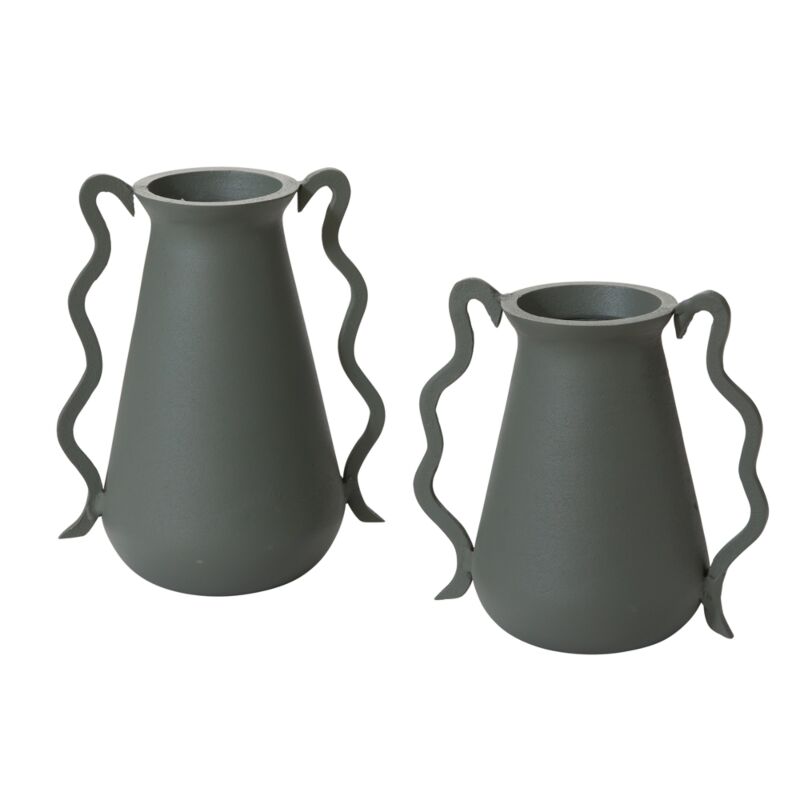 Modern & classic with distinctive squiggles, the large Mikado Vase is a unique blend of sophistication & play. Made from aluminum with a sage green tone & double wavy handles, this weighty vase offers a tasteful pop of color & fun to home decor, whether styled as a centerpiece with florals, layered into stylish shelving, or featured as a decorative piece on a console table.