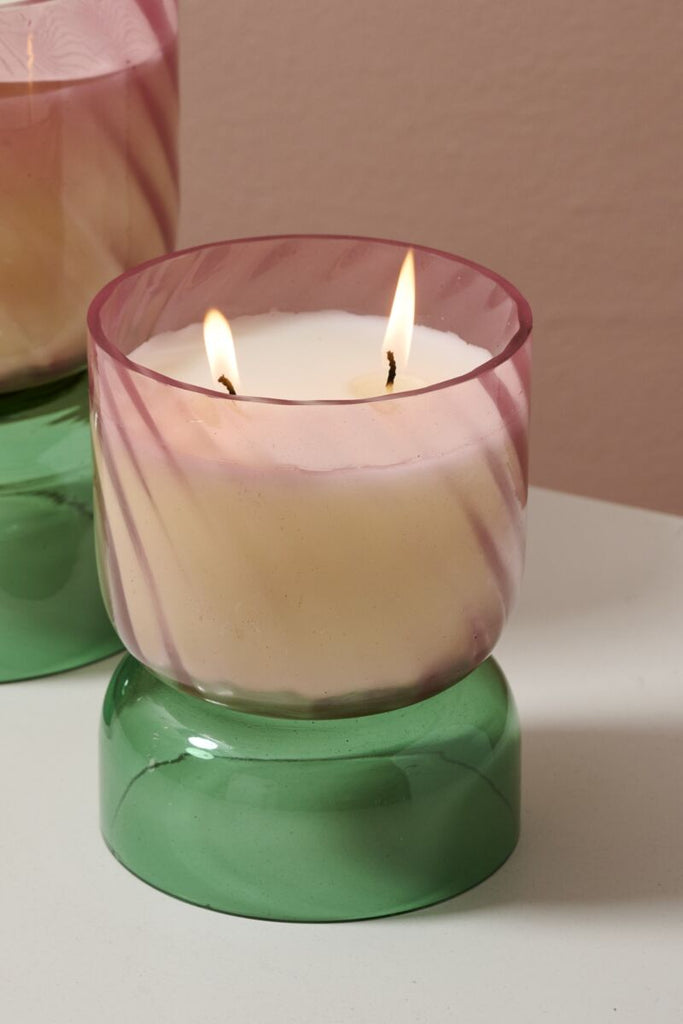 Fill the room with festive notes of evergreen and enjoy the Pink Juniper Candle's long burn time. This candle captures the scent of a wreath with a blend of apple, rhubarb, Siberian evergreen, white fir, sage, cedar, and sandalwood. Available in two sizes, these compote-shaped vessels feature two-toned pink and green glass and are perfect for repurposing as holders for drop-in plants or bunches of dried or fresh florals once the wax is used up.