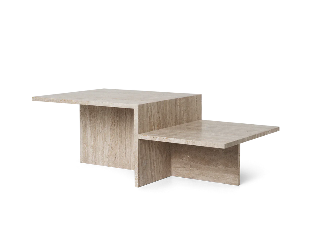 The Distinct Coffee Table from Ferm Living draws inspiration from Japanese minimalism and delves into the concept of complex structures derived from a single element. Its minimalist design offers a striking contrast to the rich textures of travertine. The sand-colored limestone, with its natural and diverse qualities, adds rawness and tactility, accentuating the architectural essence of the piece. Experience the fusion of simplicity and sophistication in this elegant furniture piece. Width 42.5", Height 13.8", Depth 24.8"