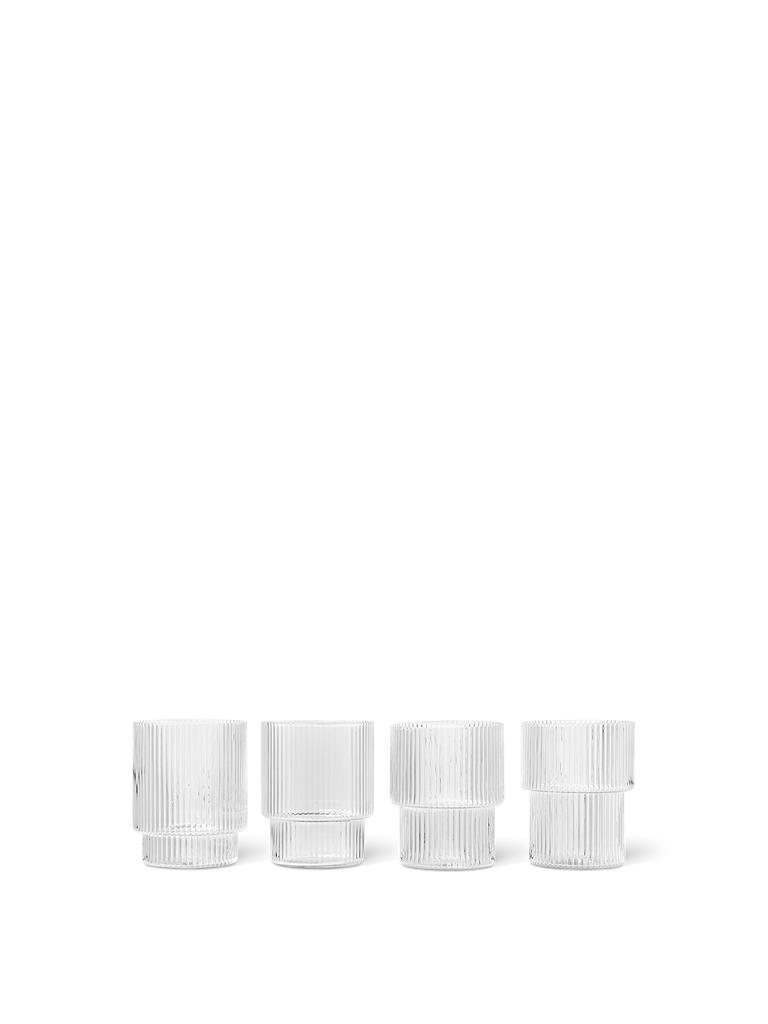 Mouth blown into the mould, this set of four low glasses features a distinctive, beautifully rippled surface. The vertical lines add a strong and sophisticated look to their understated, classic form and are perfect for casual dining.