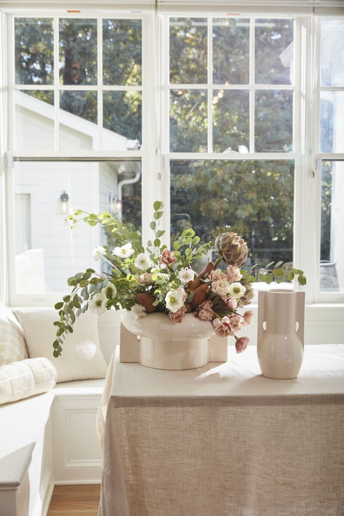 The thoughtful design of the ceramic Replay Footed Bowl offers endless creative possibilities, whether used as a decorative centerpiece, floral vessel, or planter. This versatile, watertight, uniquely shaped bowl features an open foot to support long stems, wide handles for modern flair, & alternating glossy & matte stripes on the natural white clay. With its neutral colors & interesting shape, this bowl adds eye-catching dimension to any space.